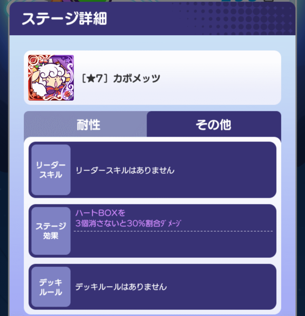 ステージ効果に「スキル発動ぷよ数〇〇個増加」がありませんが、今回はそれよりも恐ろしい「ハートBOXを3個消さないと時限爆弾が暴発」が付与されています。(正解は30%割合ダメージ)