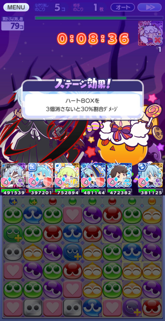 とりあえず1ターン目と5ターン目にハートBOXをバラまいてくれますが、これにより消せるはずのぷよが消滅するので、ここでもまたストレス溜まりまくりでございます。