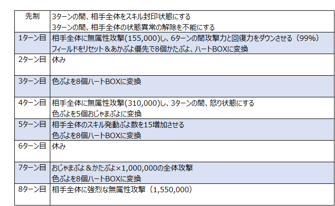 もちろんボスのギミックをかいくぐって大ダメージを与えると言うのも一つの楽しみではあると思います。でも私的にはぷよ消しでいかに早くスキルを発動させるかが、楽しみの大部分を占めているので、何もできない状態を3ターンも用意されても全く面白くない!