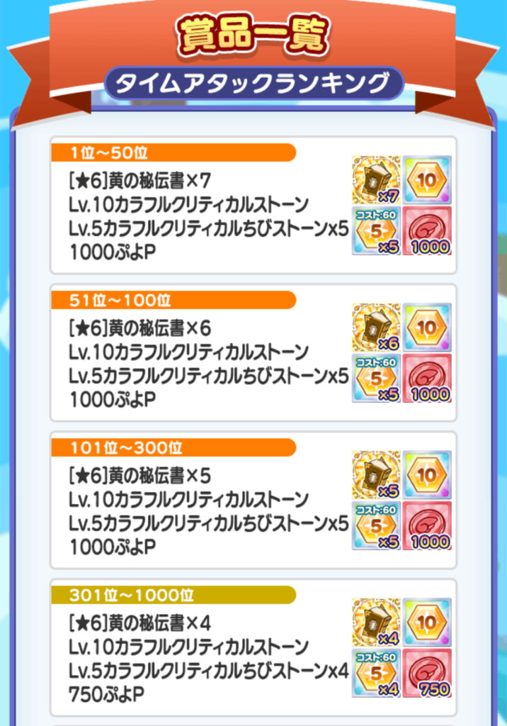 ハイスコアイベントは特効キャラに左右される部分がありますが、最速クリアタイムイベントは普段、日の目を見ないキャラにスポットが当たるので良いのではないでしょうか。